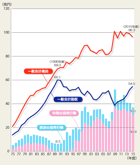 税収が60兆円を超えたのは、1990年度のバブル景気の時期だけですね。